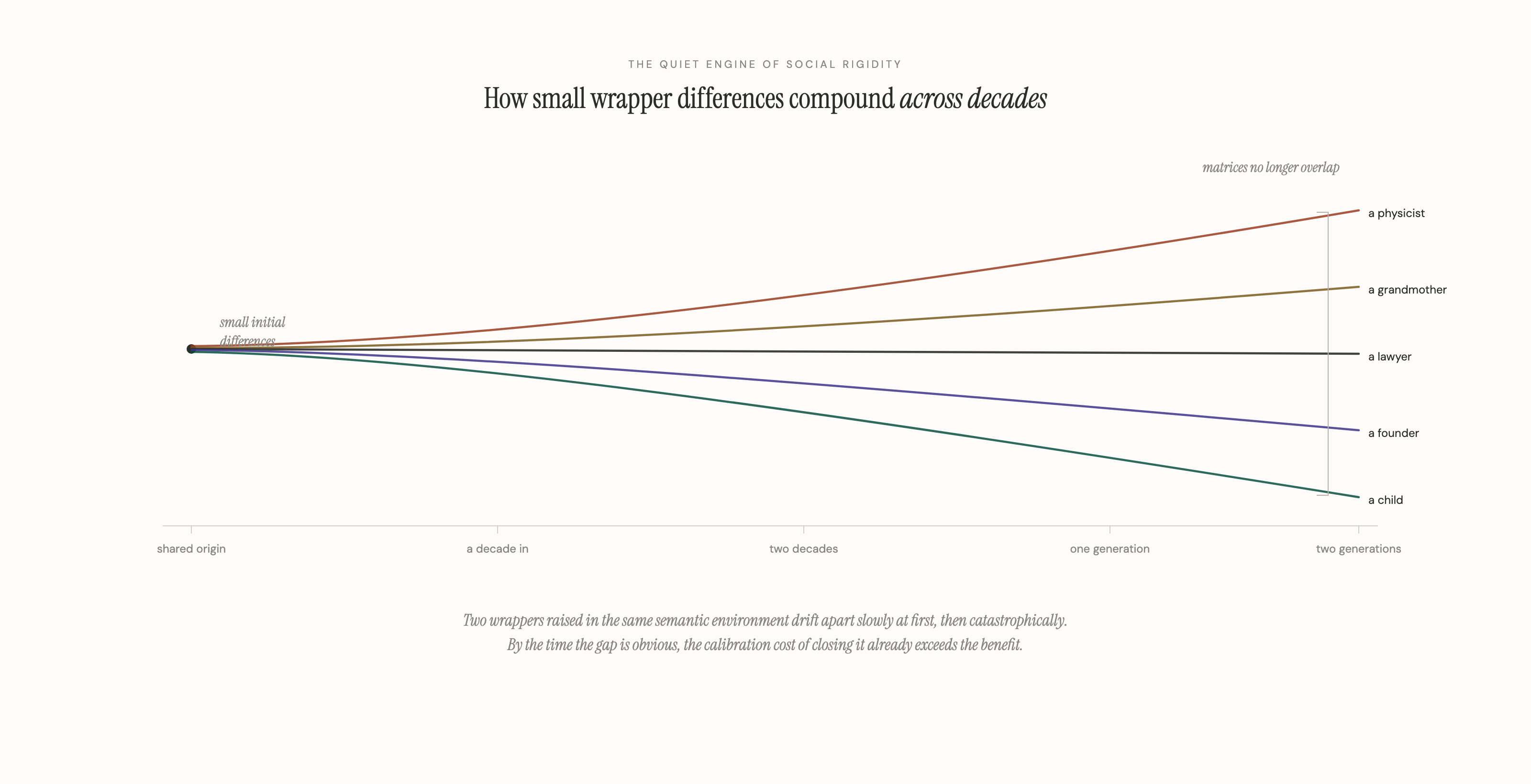 The initial difference between any two wrappers is small. Compounded across decades, it produces a civilization in which the matrices of one class, one profession, one generation cease to overlap with the matrices of another. At that point the argument has reached its civilizational stakes.