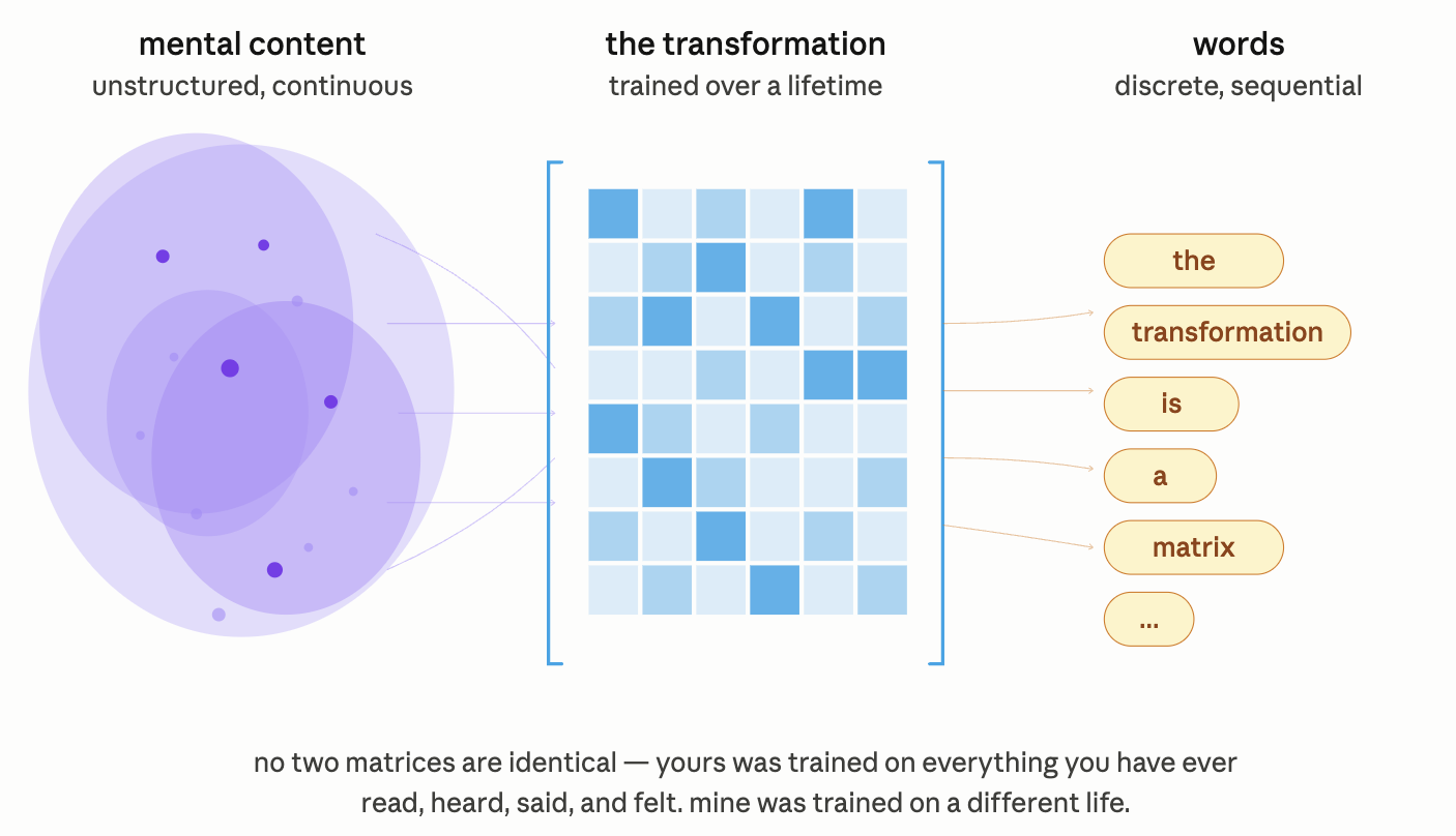 State the model precisely. Before speech or writing, there is only the mindstream — the uncompressed flow of experience, feeling, half-noticed pattern. Language is what happens when the mindstream passes through a transformation. The transformation is a matrix, trained over a lifetime. It takes mental content as input and returns words as output. Every mind has one. No two are identical.