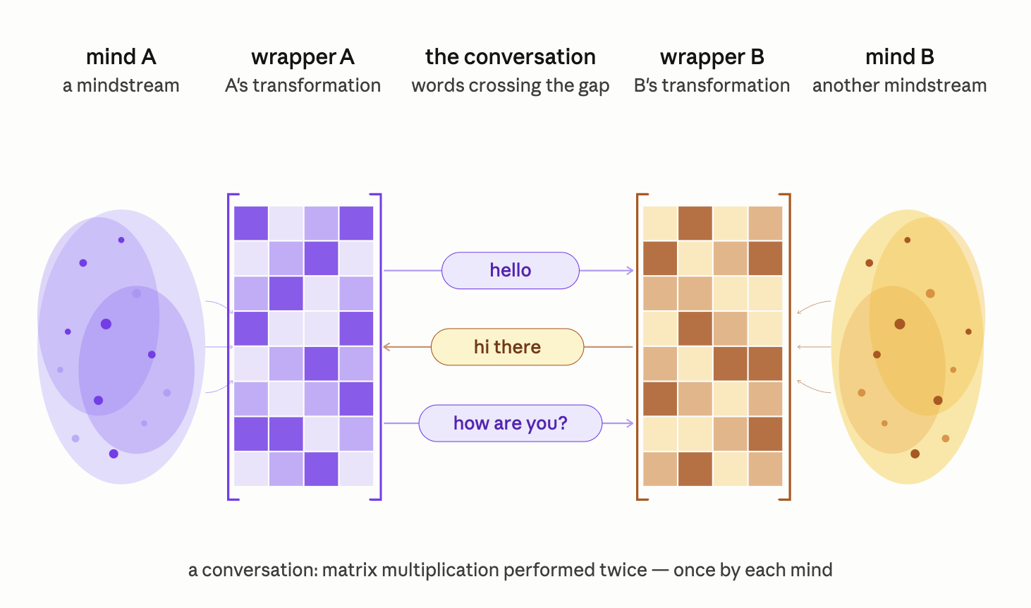 The alternative, circled by 3 thinkers across 40 years but never quite formalized, runs like this. Every mind carries a transformation matrix — trained over a lifetime of reading, listening, and being forced to speak — which takes the mindstream as input and returns words as output. Words are not the packaging of thought. They are the shape thought takes when it leaves you. Two wrappers. Two operations. One conversation. What we call a conversation is a matrix multiplication performed twice, once by each mind.